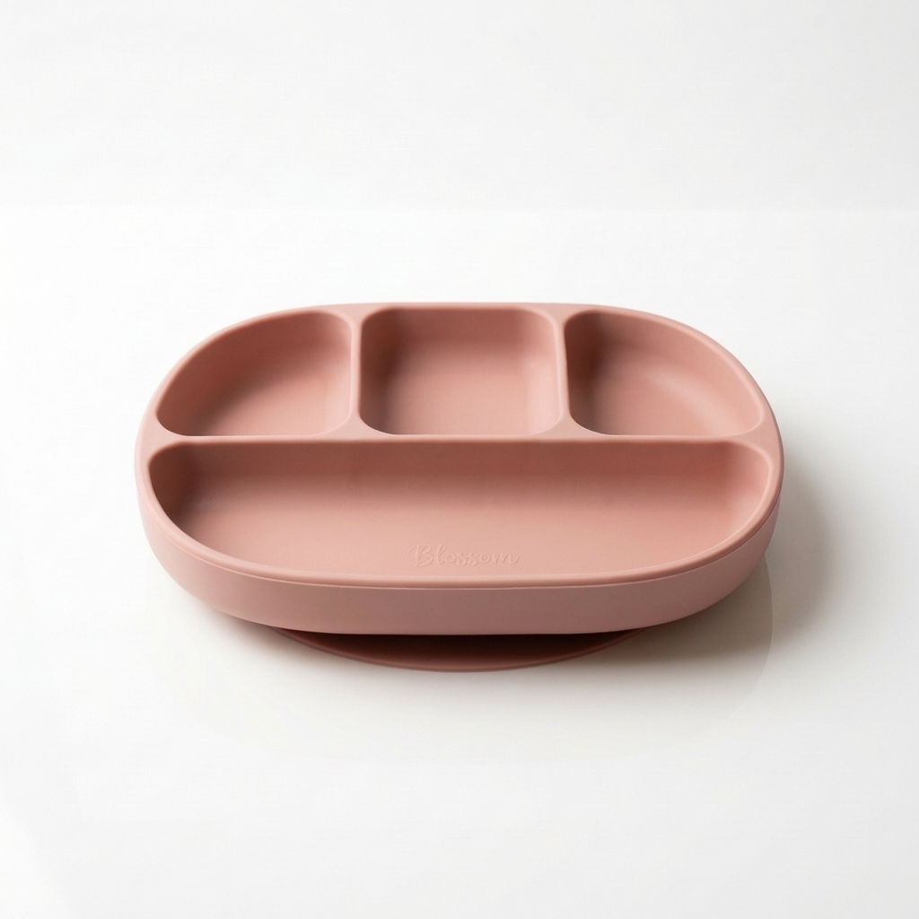 Assiette en silicone alimentaire sans BPA avec ventouse ultra-adhérente et 4 compartiments pour organiser les repas de bébé. Idéale pour la DME (diversification menée par l’enfant), elle est compatible lave-vaisselle et micro-ondes. Certifiée CE.