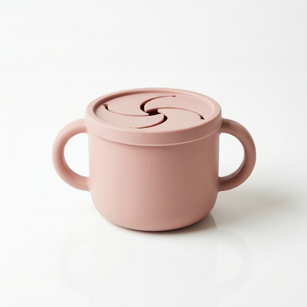 Snack cup en silicone alimentaire sans BPA avec couvercle anti-renversement à lamelles souples et deux anses faciles à saisir. Parfait pour les en-cas en déplacement. Compatible lave-vaisselle. Certifié CE.